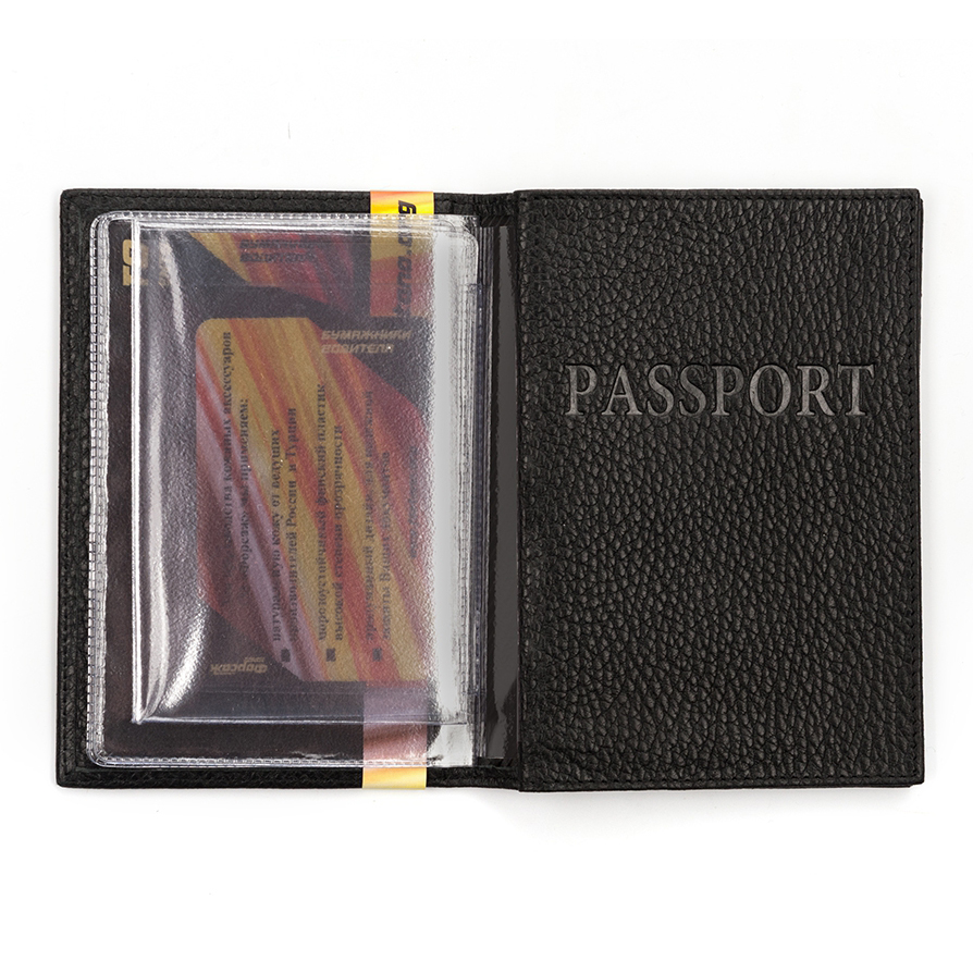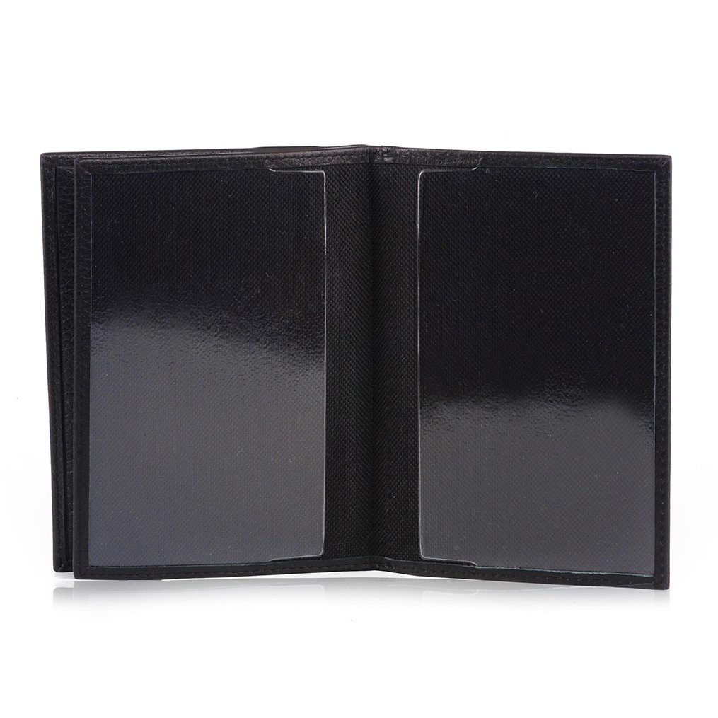 Бумажник водителя стандартного размера из натуральной кожи. Внутри 4 прорезных кармана для карт и сменный пластиковый блок для документов с вкладышем формата А5. Бумажник дополнен отделением для паспорта с пластиковыми карманами.