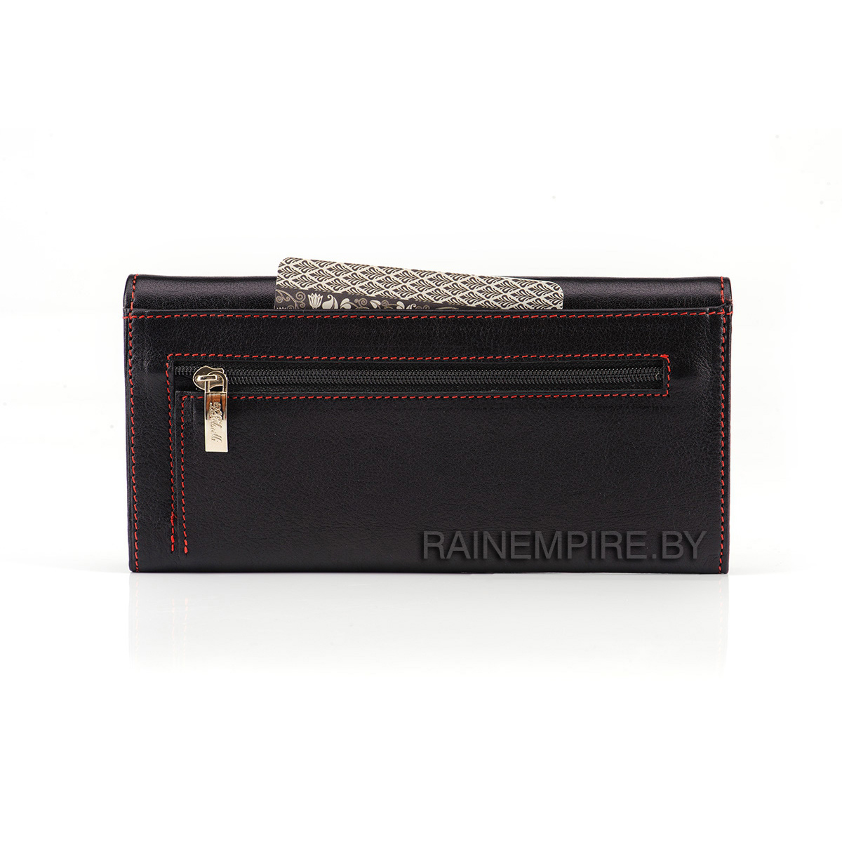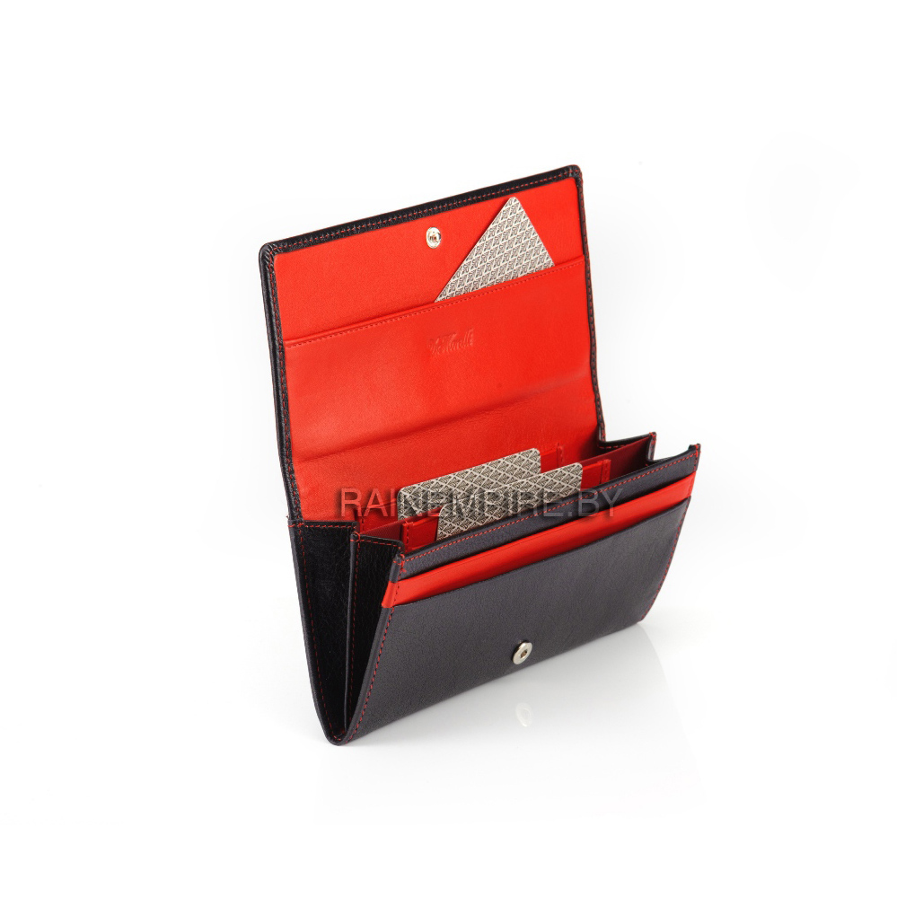 Большое женское портмоне из натуральной кожи. Закрывается на кнопку. Внутри два отделения для купюр, два больших сборных кожаных кармана и по четыре маленьких сборных кармашка в каждом отделении, а также глубокий потайной карман. На обороте портмоне удобный монетник на молнии и потайной карман.