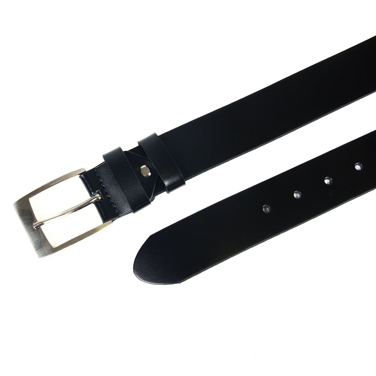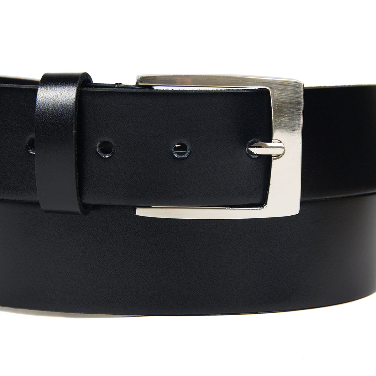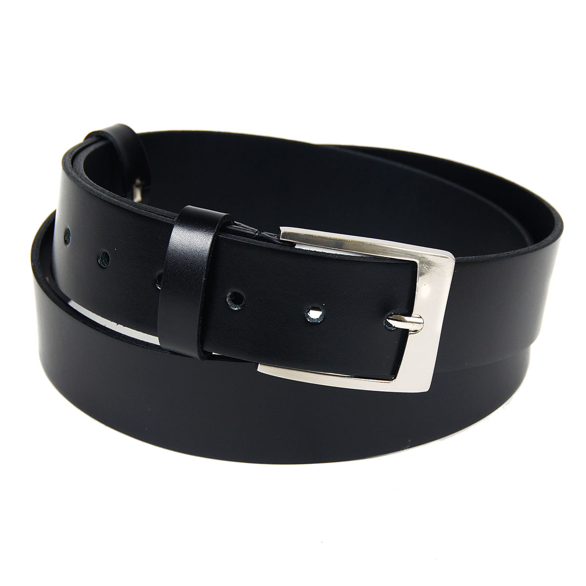 Стильный брючный мужской ремень из натуральной кожи черного цвета, дополненный стильной пряжкой.