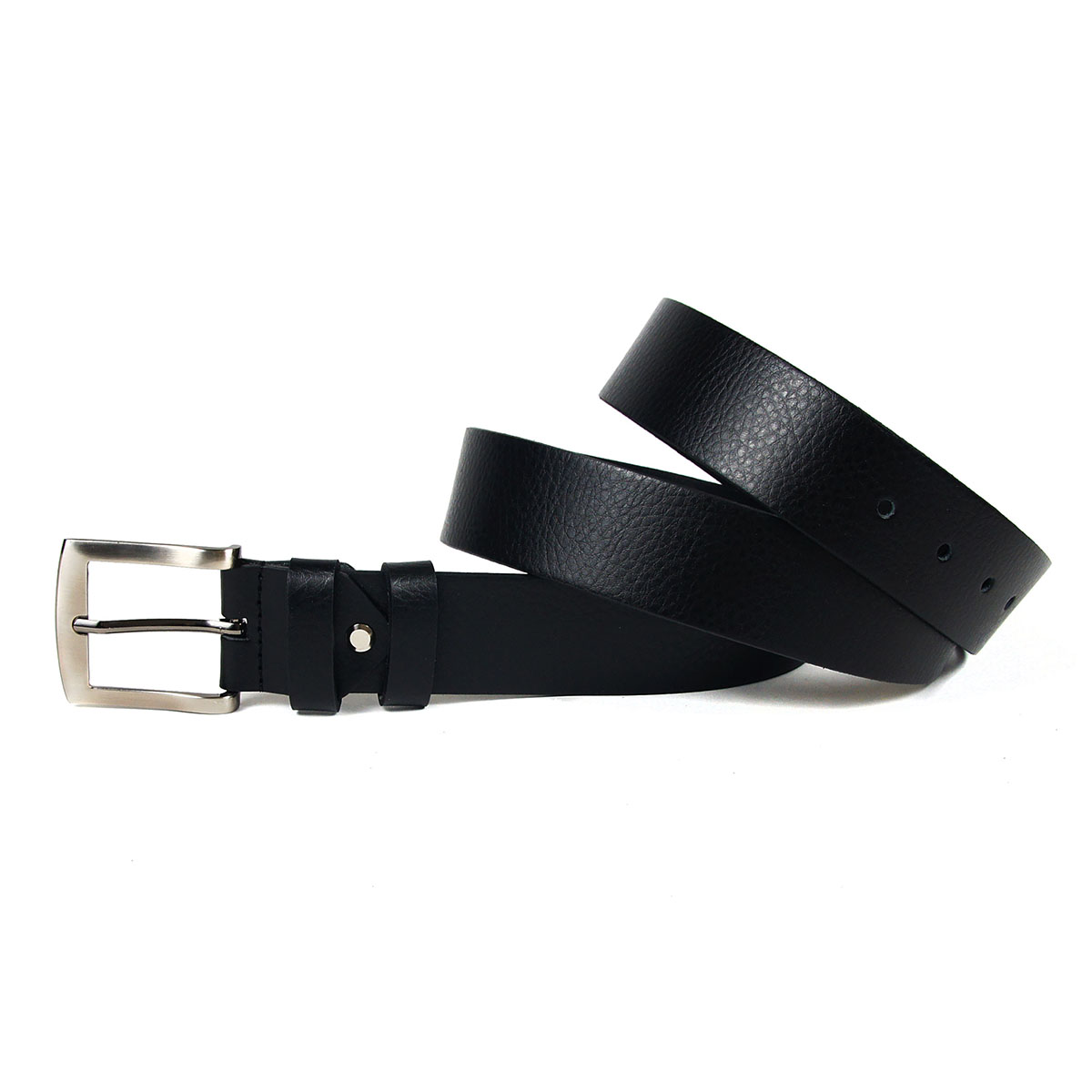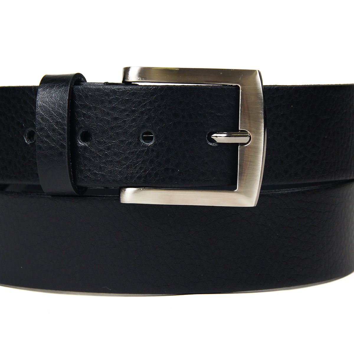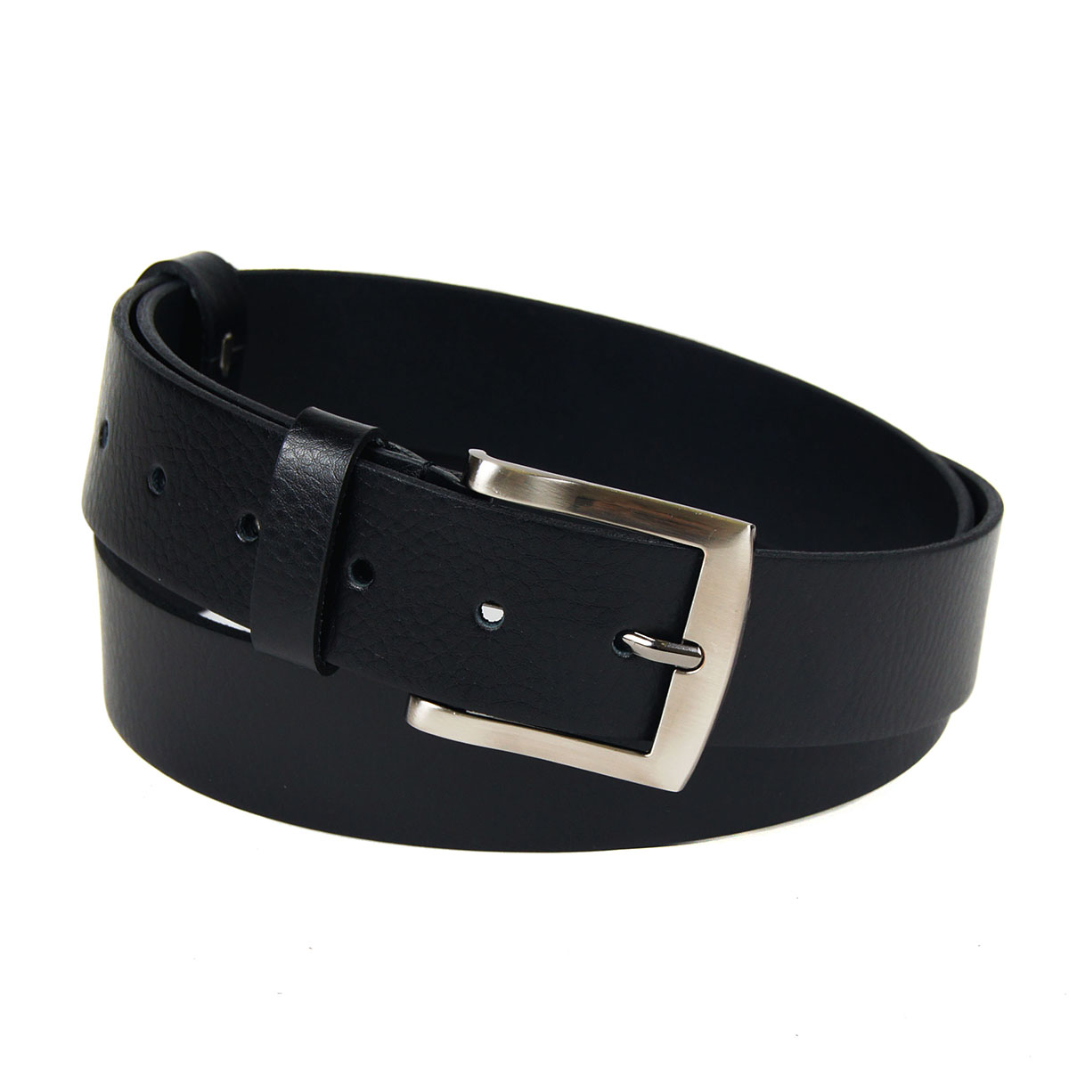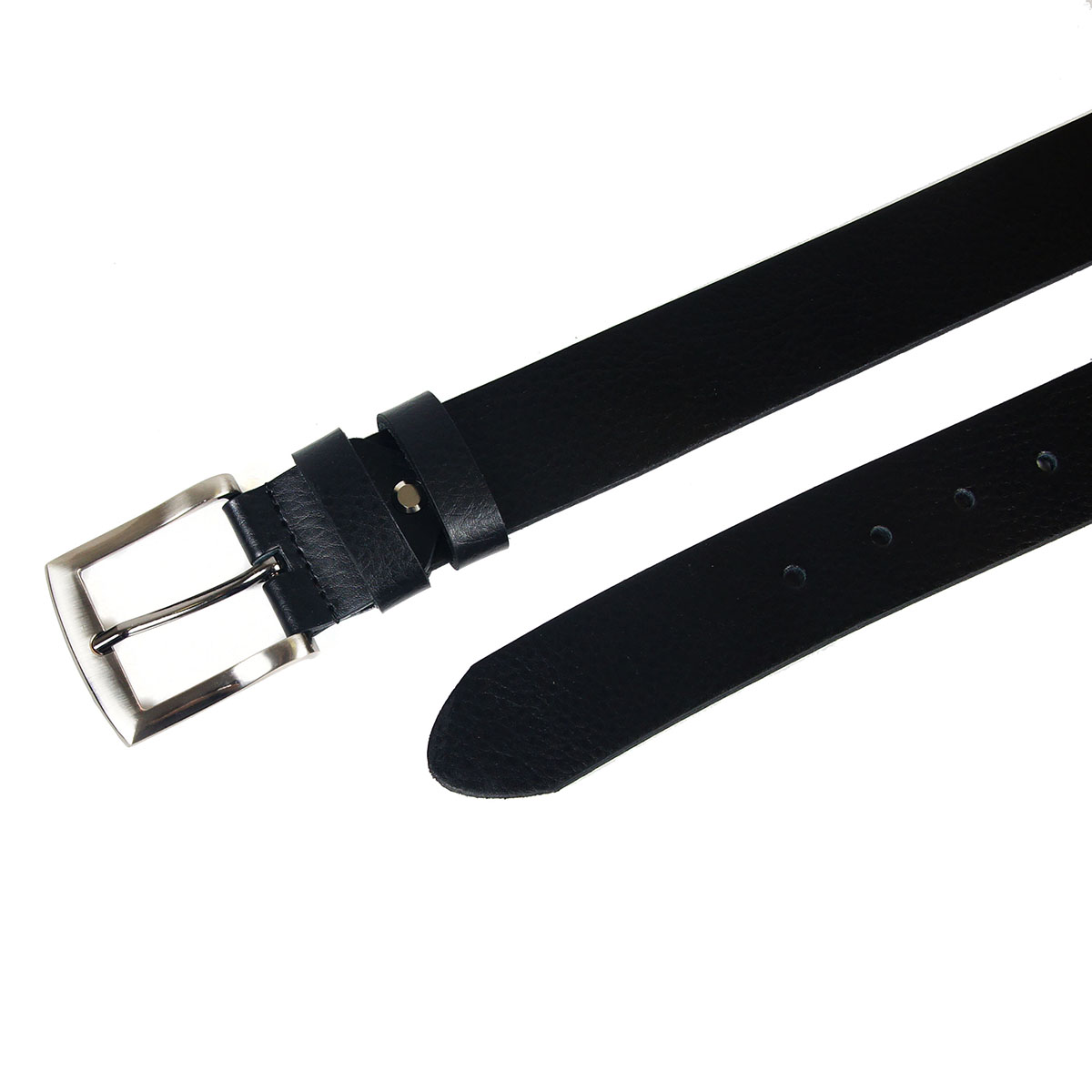 Стильный брючный мужской ремень из натуральной кожи черного цвета, дополненный стильной пряжкой.