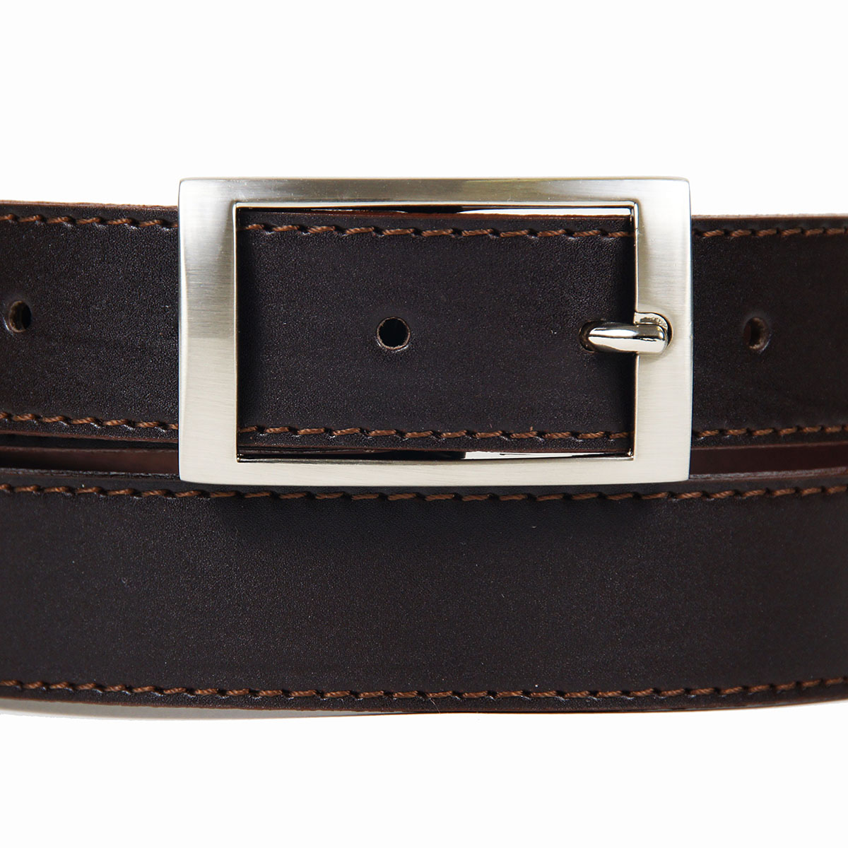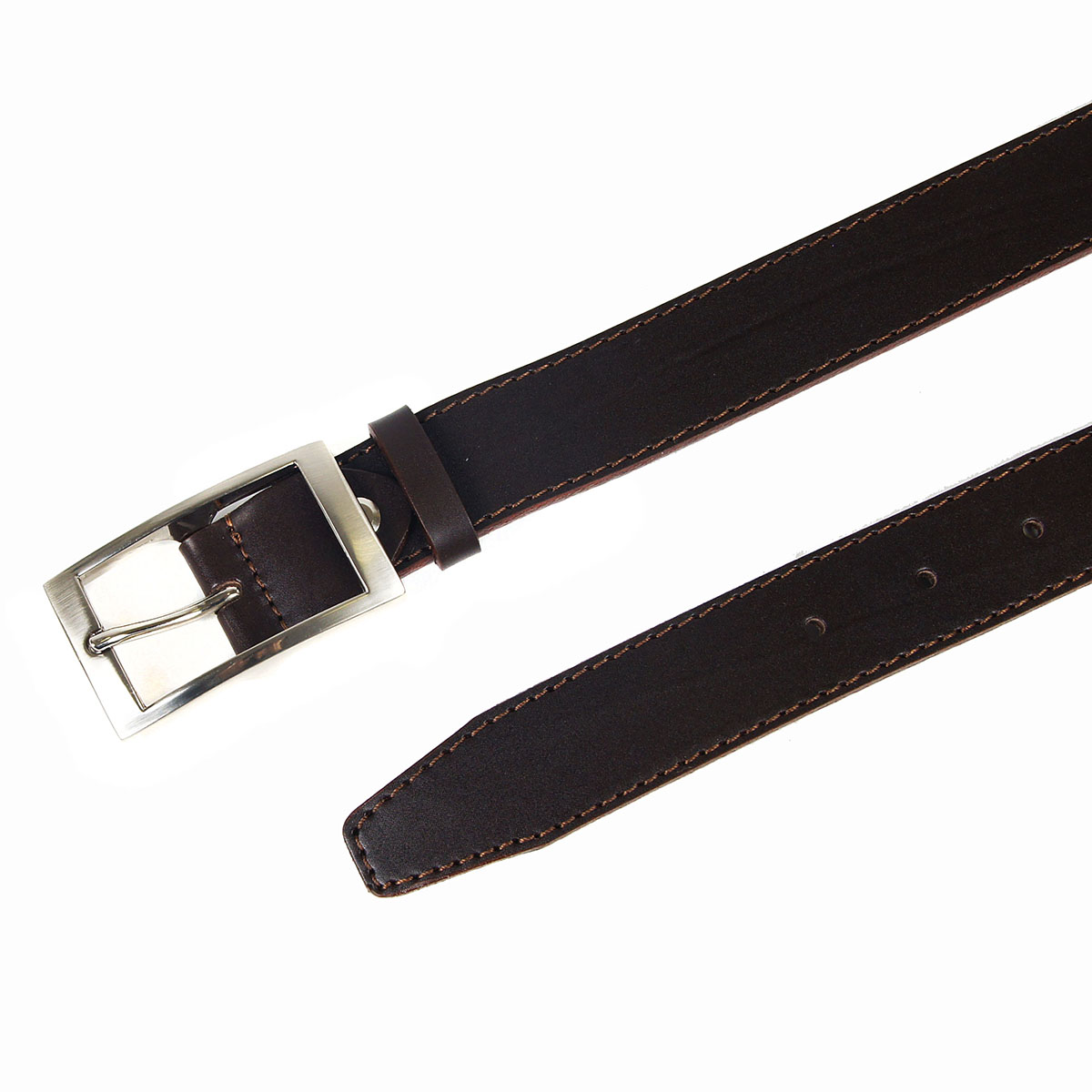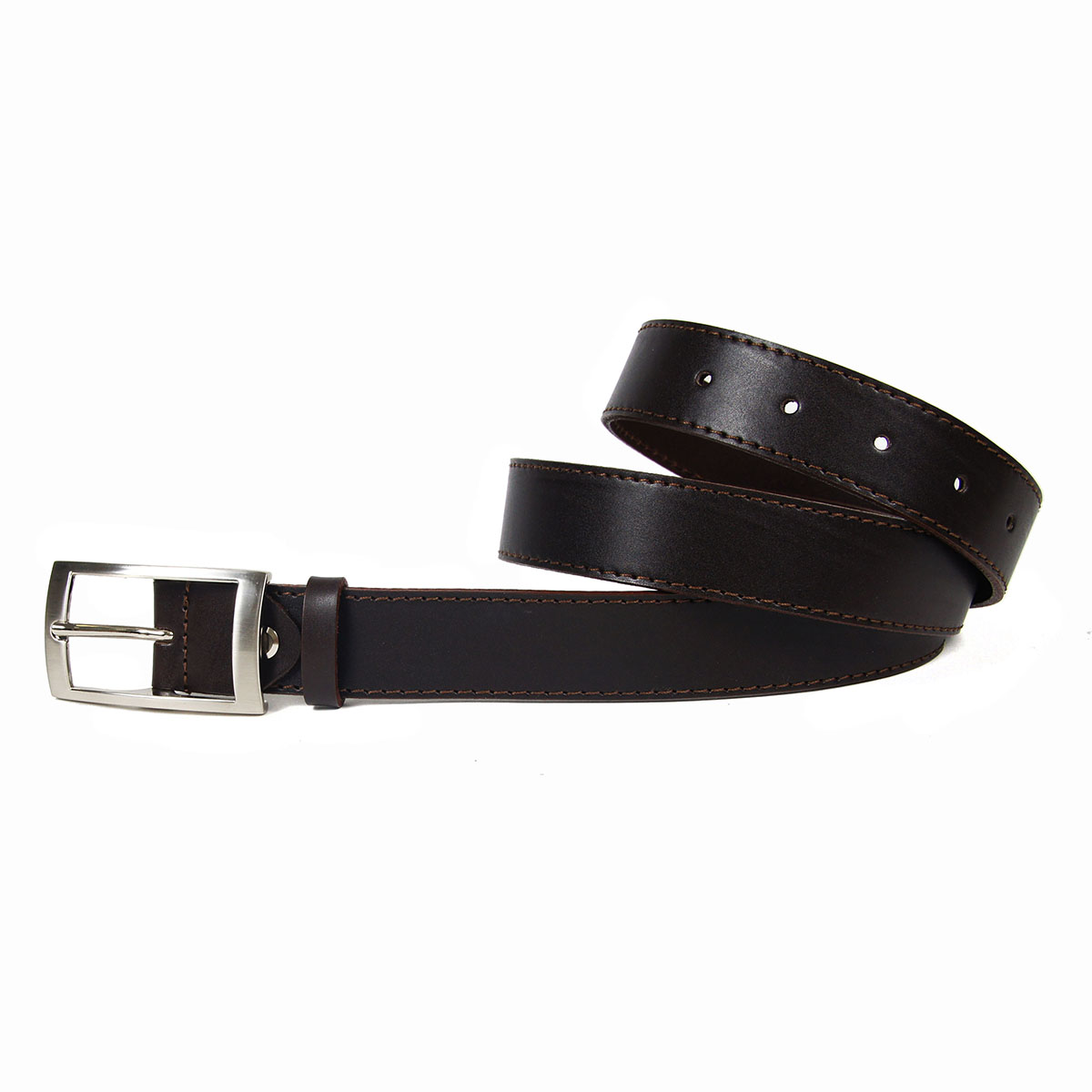 Классический женский ремень из натуральной коричневой кожи со строчкой, дополненный прямоугольной пряжкой.
