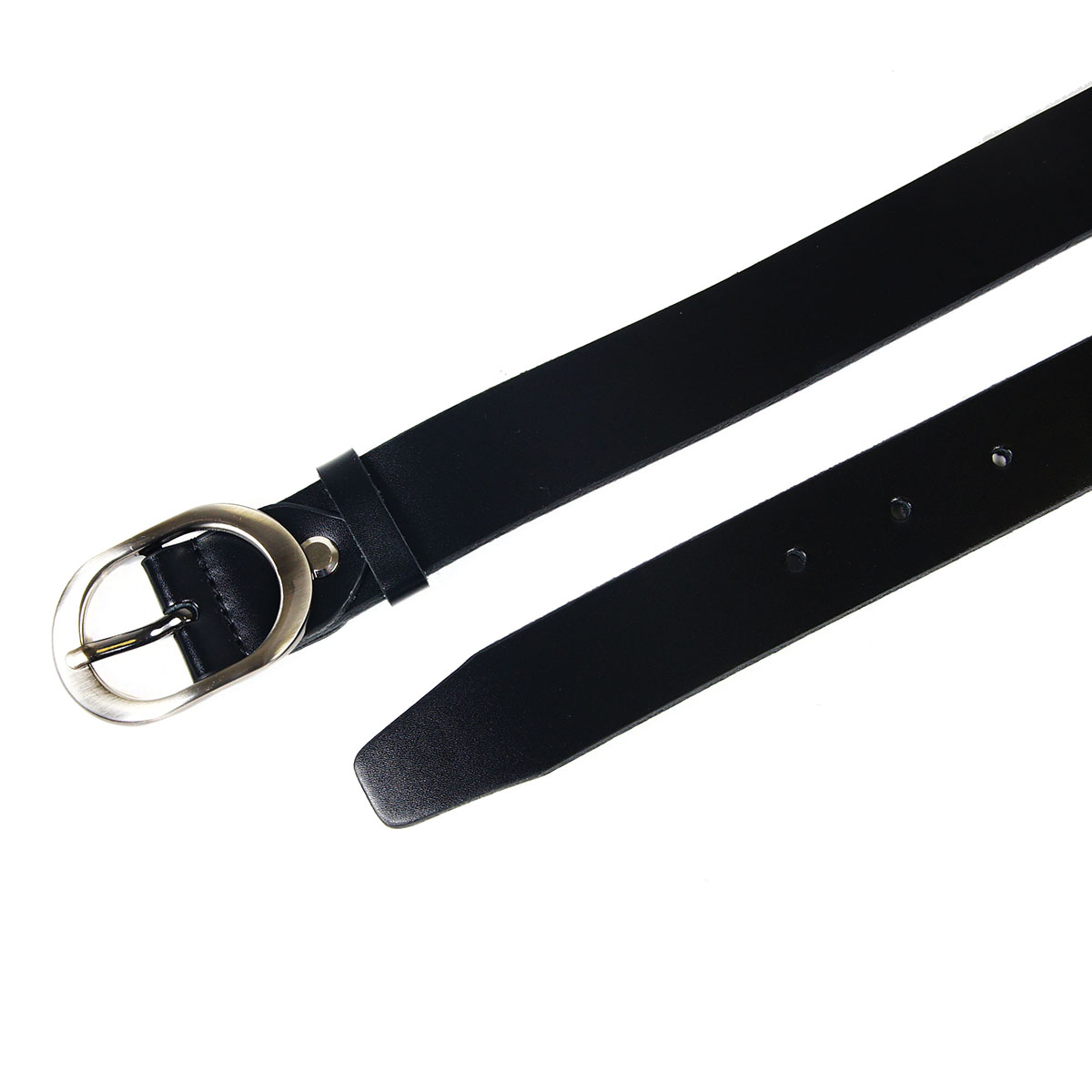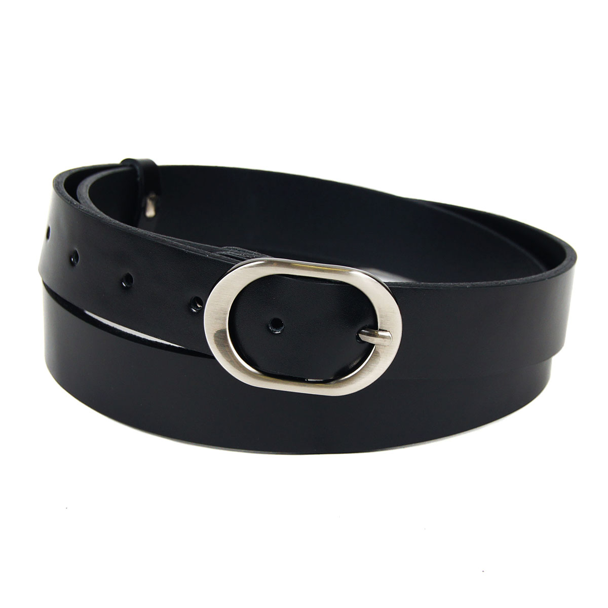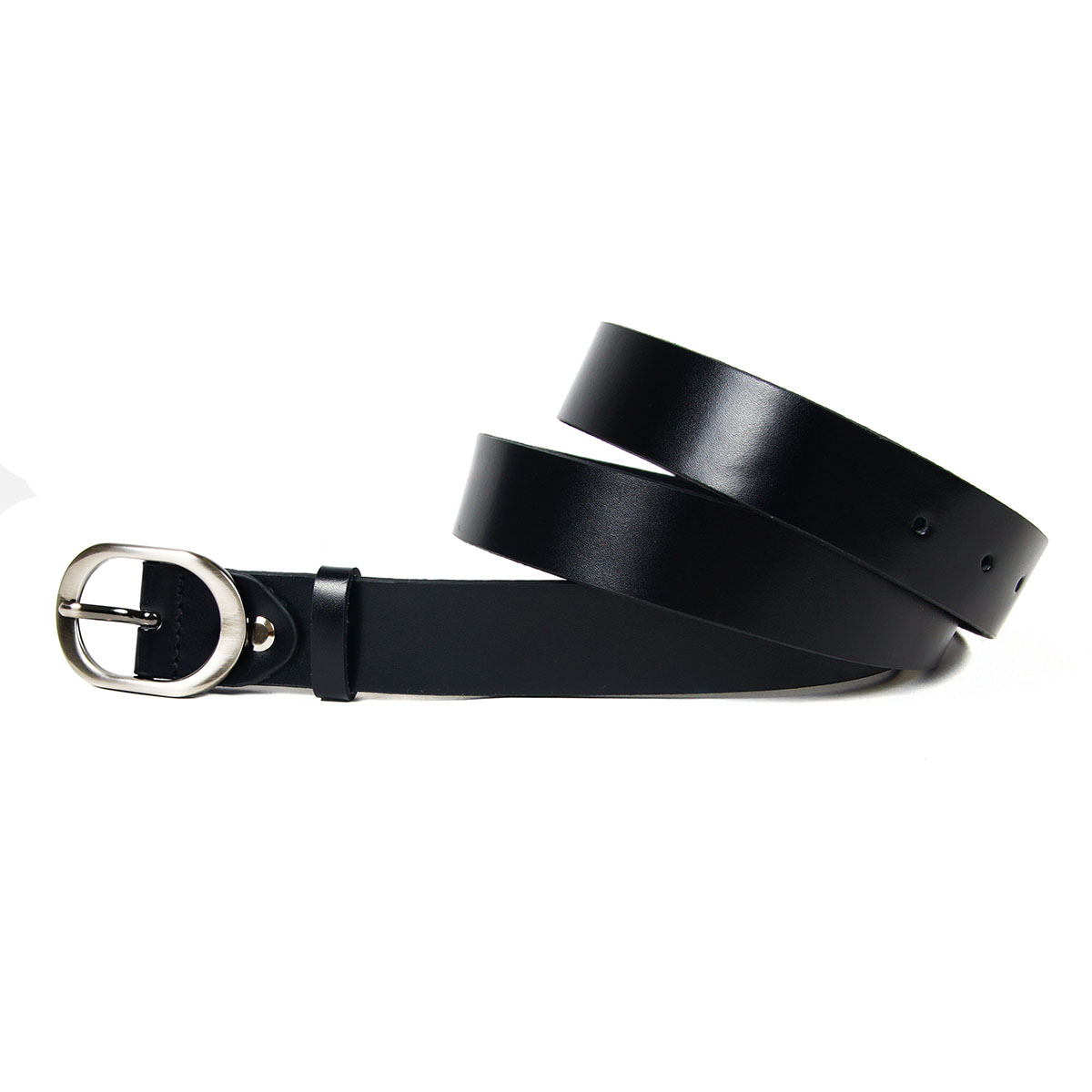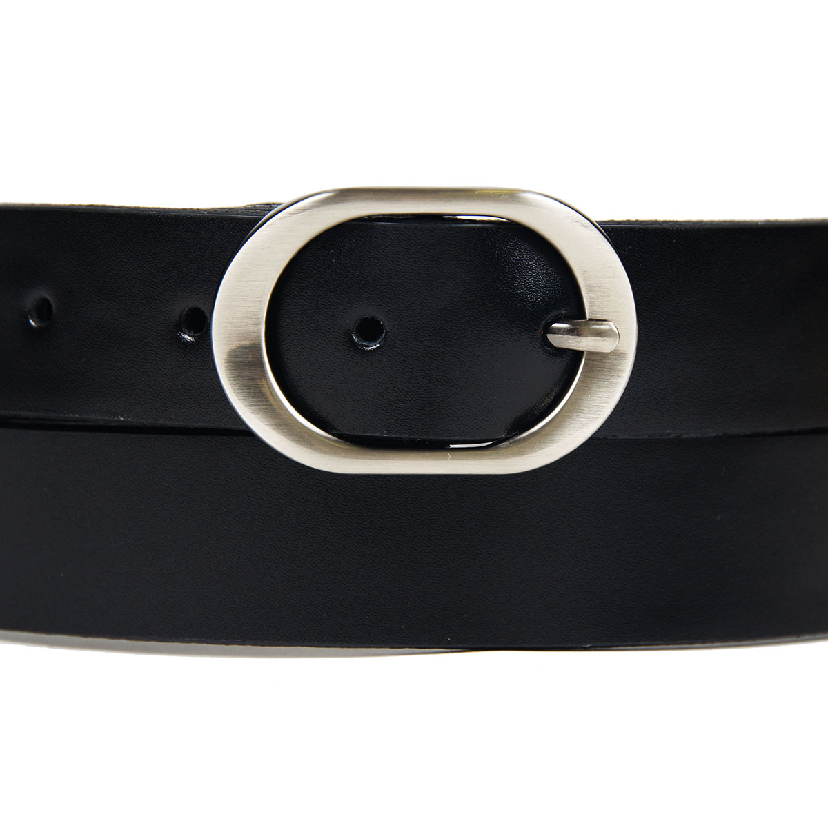 Классический женский ремень из натуральной гладкой кожи черного цвета, дополненный закругленной пряжкой.